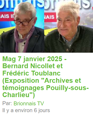 A l’occasion du montage de l’exposition « Pouilly-sous-Charlieu se raconte ! », Bernard Nicollet et Frédéric Toublanc , tous deux membre de la commission histoire locale à l’origine du projet d’exposition histoire, ont été interviewé par Guillaume Decaves sur la chaine Brionnais TV pour nous parler de cette initiative.