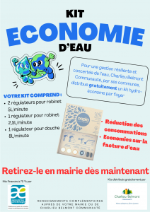 Les foyers du territoire qui en font la demande peuvent bénéficier d’un kit hydro-économe distribué gratuitement par Charlieu Belmont Communauté dans le cadre de la démarche de protection de la ressource et de sobriété des usages de l’eau. Ce kit est à retirer en Mairie. Il s’installe facilement sur les robinets ou sur la douche et permet de réduire les volumes consommés de près de 50 %. A noter que d’autres gestes simples doivent être adoptés par tous : rétention et utilisation des eaux de pluie pour l’arrosage ou le nettoyage extérieur, installation d’une bouteille ou d’une brique dans le réservoir des toilettes pour réduire le volume rejeté …