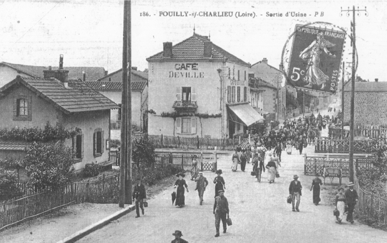 La sirène de l’usine vient de retentir… C’est le sifflet à vapeur qui rythme la journée de travail à l’usine. Les ouvrières quittent alors la cité en passant par l’avenue Brossard. Au premier plan le café MONT suivi de la pâtisserie COURTOT (cf photo ci-dessous).